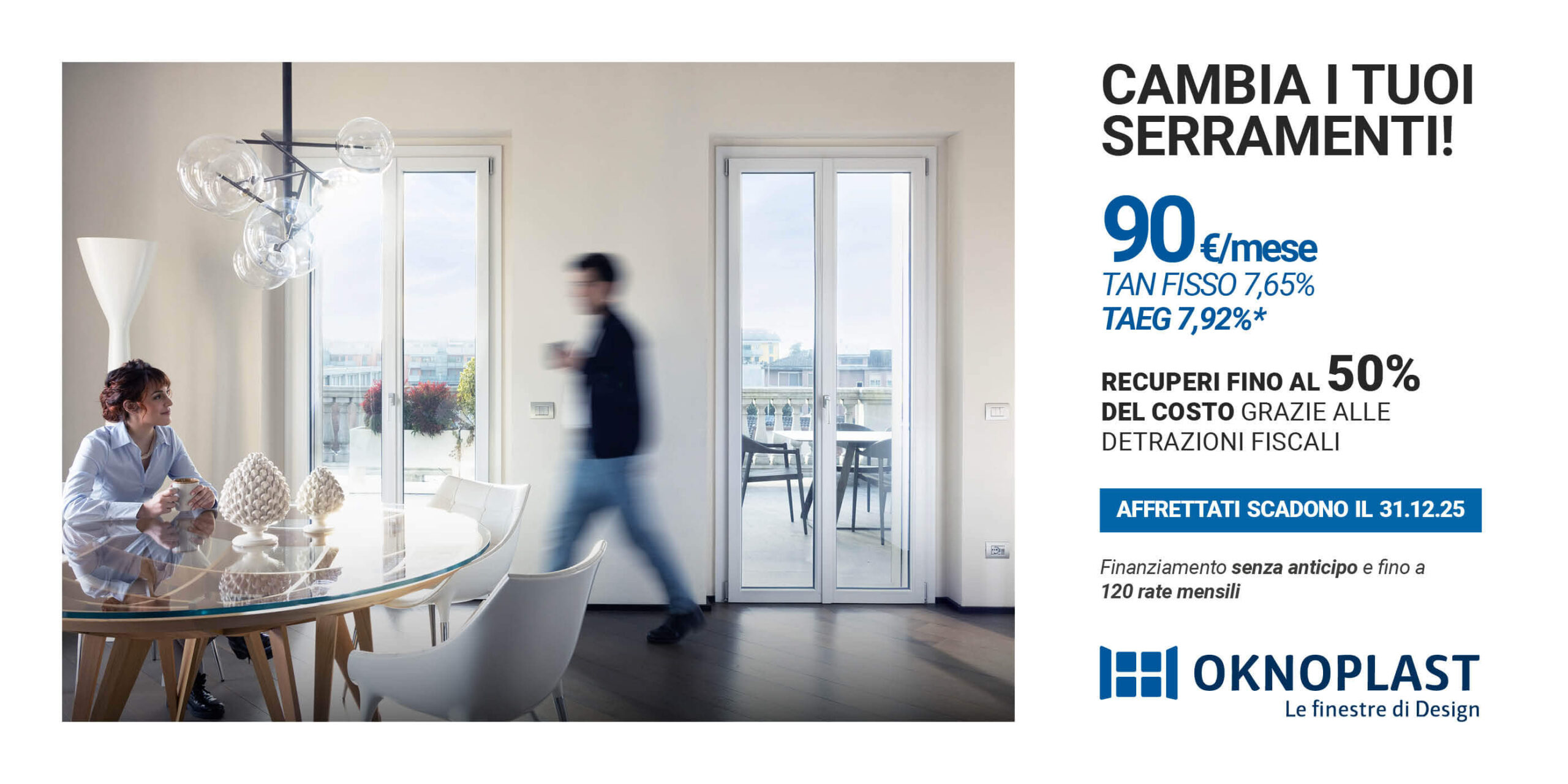 Messaggio pubblicitario con finalità promozionale. Per le condizioni contrattuali si veda il documento “IEBCC” presso la Sede Fiditalia e i Punti Vendita aderenti all’iniziativa. Importo finanziabile fino a € 50.000 Esempio: Prezzo del bene: € 7.500,00 – Anticipo € 0,00 –.Importo totale del credito € 7.500,00 – Prima rata a 30 gg – Durata del contratto di credito 120 mesi con 120 rate mensili da € 90,00 – Importo totale dovuto € 10.749,60. TAN FISSO 7,65% TAEG 7,92%. Spese di gestione del finanziamento ricomprese nel TAEG: Spese di istruttoria pari a € 0,00 – Imposta di bollo € 0,00 – Spese incasso rata € 0,00 – Spese invio rendiconto € 0 (annui) più imposta di bollo € 0,00 per saldi superiori a €77,47. I Premium Partner Oknoplast operano quale intermediario del credito in regime di non esclusiva con Fiditalia. La valutazione del merito creditizio è soggetta all’approvazione di Fiditalia SpA. Offerta valida sino al 31.12.2025.
